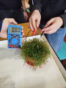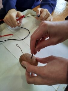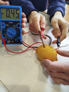 І на останок, учні – електромонтери продемонстрували свій проєкт з хімії. Показали гальванічні елементи з картоплі, лимону та квітів, які вони зробили самі та поділилися досвідом роботи. За активну роботу учні отримали подяки.