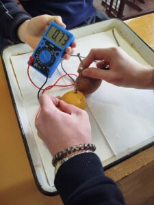І на останок, учні – електромонтери продемонстрували свій проєкт з хімії. Показали гальванічні елементи з картоплі, лимону та квітів, які вони зробили самі та поділилися досвідом роботи. За активну роботу учні отримали подяки.